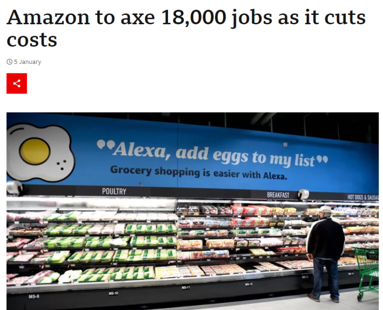 아마존의 성장세가 둔화되면서 취약한 일부 비즈니스를 폐쇄하고 인력을 줄이고 있는 추세입니다. 이미 22년 말에 18,000명의 정리해고를 발표했으며 올해 9,000명의 일자리를 추가로 삭감할 계획입니다.